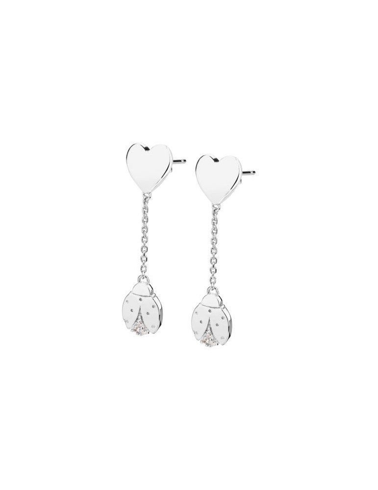 Orecchini in argento 925 a forma di cuore con pendente coccinella con zirconi bianchi. Peso: 4,60 g