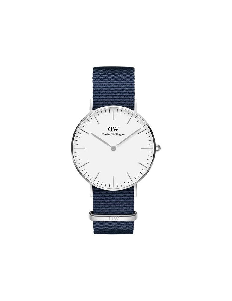 modello Classic Bayswater, con cassa da 36 mm argento, cinturino in resistente tessuto blu e quadrante bianco