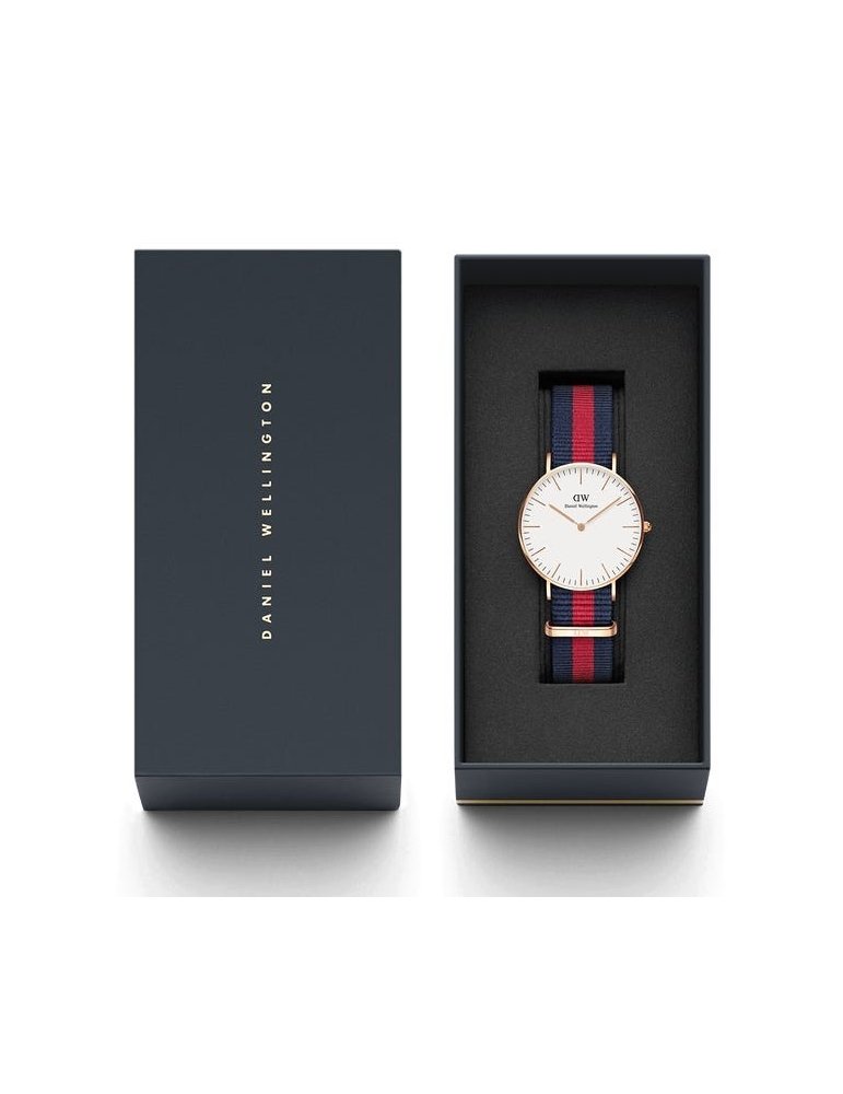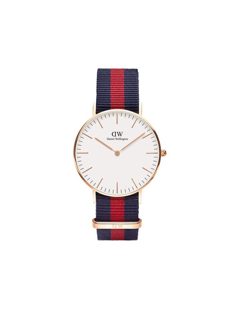 modello Classic Oxford, con cassa da 36 mm oro rosa, cinturino in resistente tessuto blu/rosso e quadrante bianco