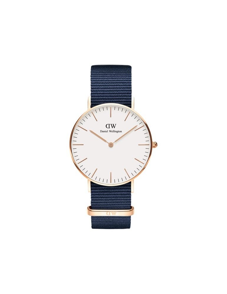 modello Classic Bayswater, con cassa da 36 mm oro rosa, cinturino in tessuto blu e quadrante bianco