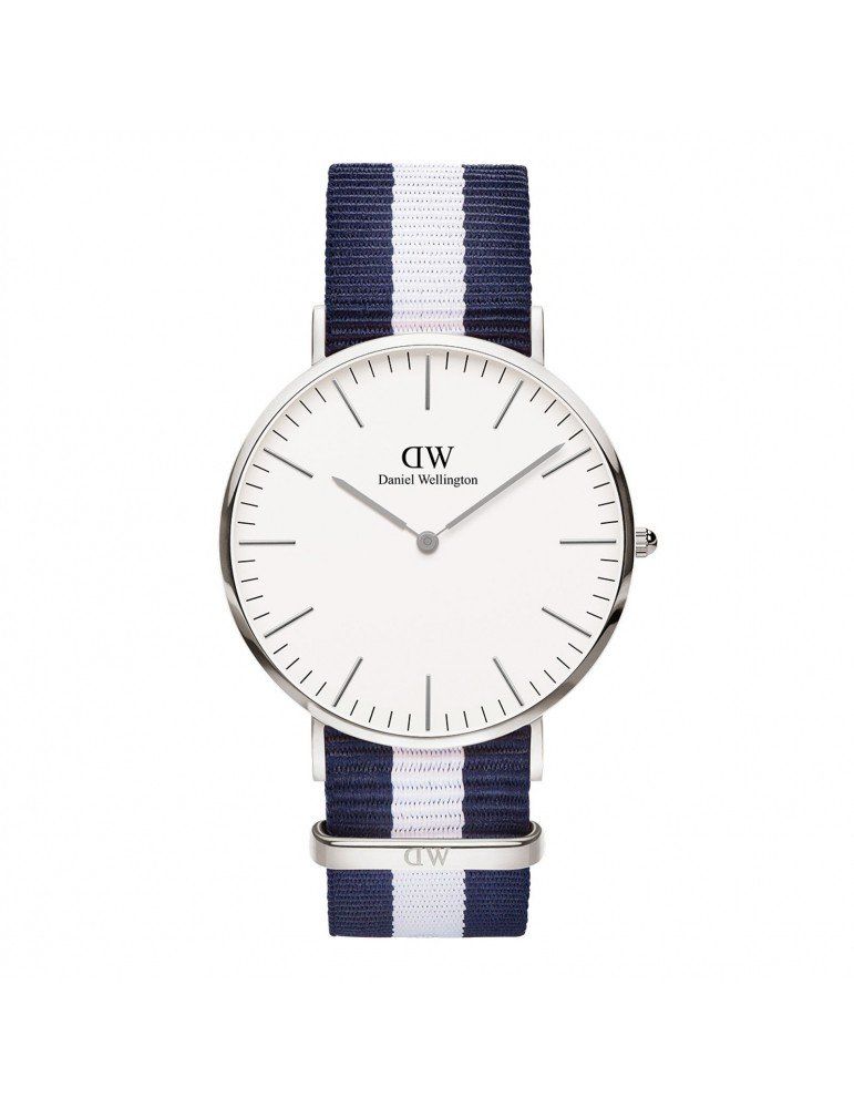 modello Classic Glasgow, con cassa da 40 mm argento, cinturino in tessuto blu/bianco e quadrante bianco