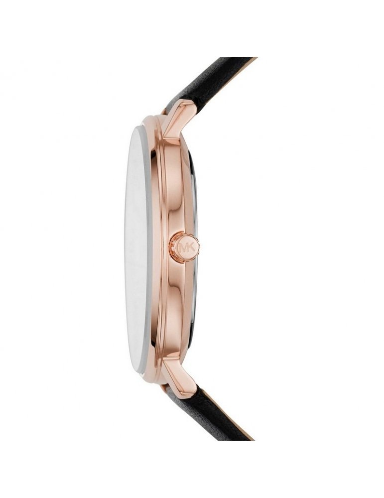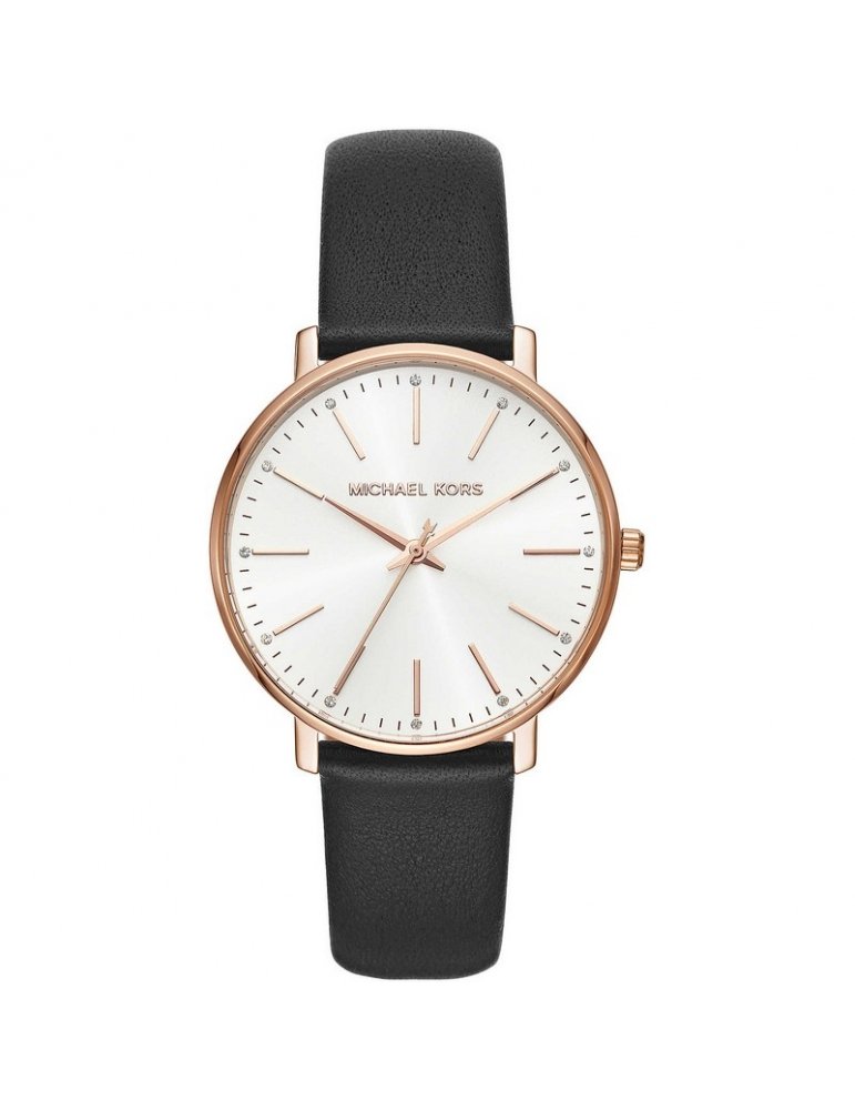 L'orologio Pyper della Michael Kors è l'emblema dell'eleganza quotidiana. Questo modello tonalità oro rosa presenta un cinturino in pelle nera e un quadrante minimalista.