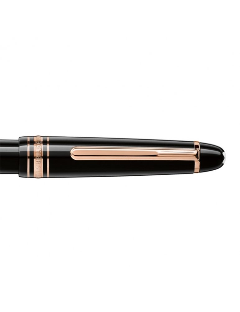 La Meisterstück Red Gold Classique è realizzata in pregiata resina nera. Questo materiale prezioso forma il corpo e il cappuccio di questa elegante stilografica, che è divenuta un'autentica icona del lusso ben al di là della cultura della scrittura. Le scintillanti finiture oro rosso, l'emblema a stella bianca e il pennino in oro rosso lavorato a mano impreziosiscono la sua estetica raffinata.