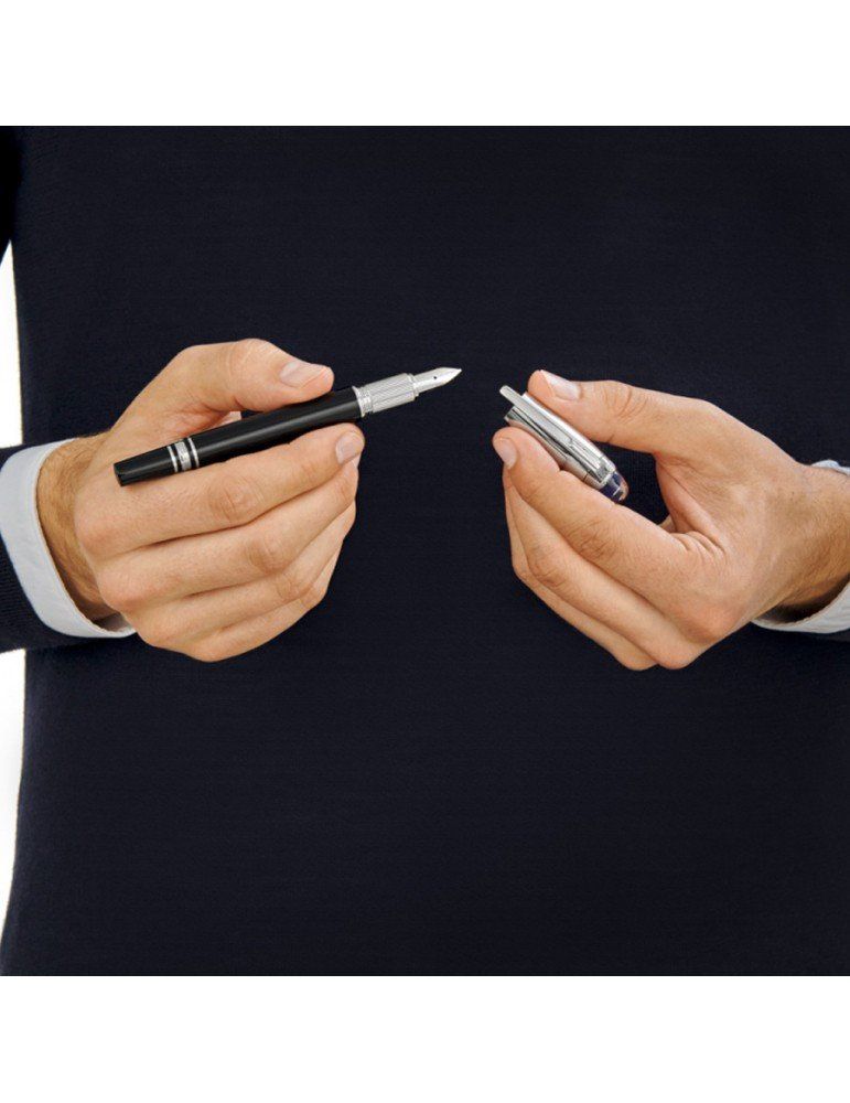 La nuova StarWalker racconta di un viaggio fra le stelle, alla scoperta del cosmo e di galassie sconosciute, per partecipare a una delle avventure più misteriose e potenti del genere umano: l’esplorazione dello spazio. Il nuovo design della collezione celebra l’emozione immensa, descritta da tutti gli astronauti, della visione del nostro pianeta azzurro che fluttua nella vastità sconfinata dello spazio. La tecnologia dell’emblema StarWalker presenta una cupoletta azzurra traslucida sotto l’emblema Montblanc, ispirata alla Terra che emerge dall’orizzonte lunare. La StarWalker Doué si presenta con cappuccio e dettagli finitura platino e con corpo in pregiata resina nera. La stilografica è lavorata a mano con pennino in oro 14 K / Au 585 finitura rodio.