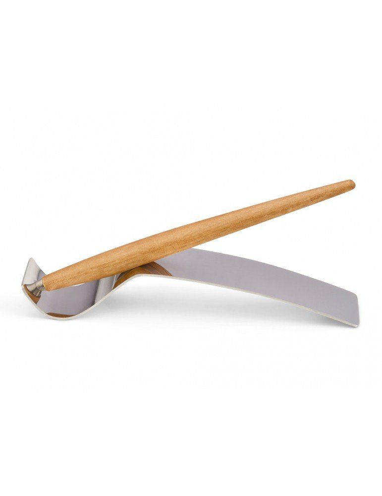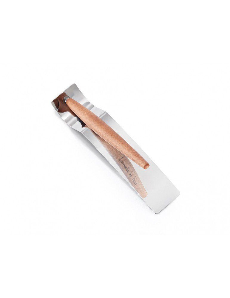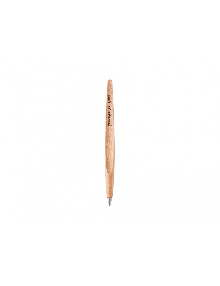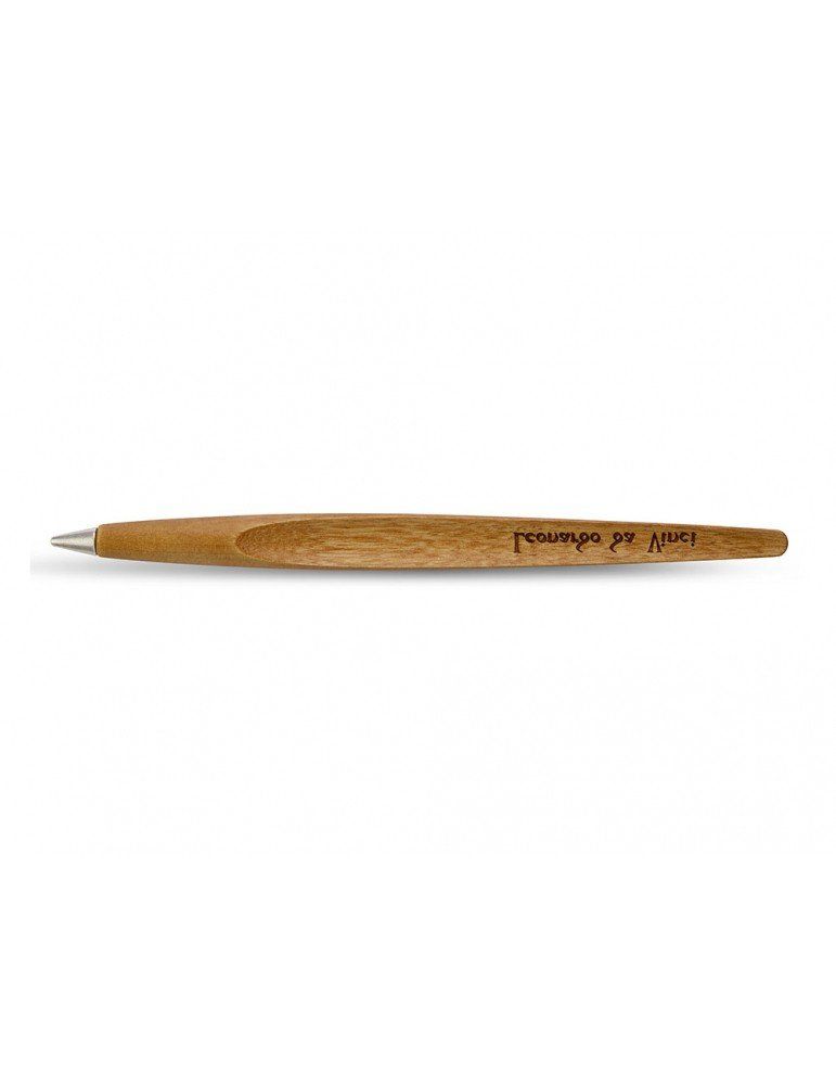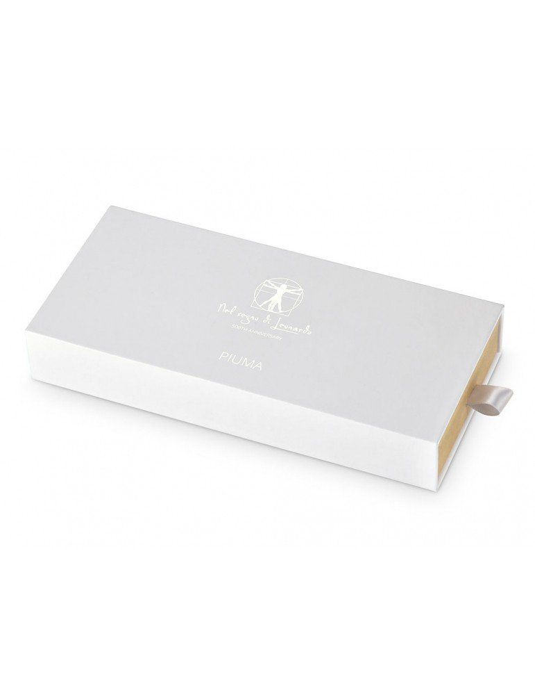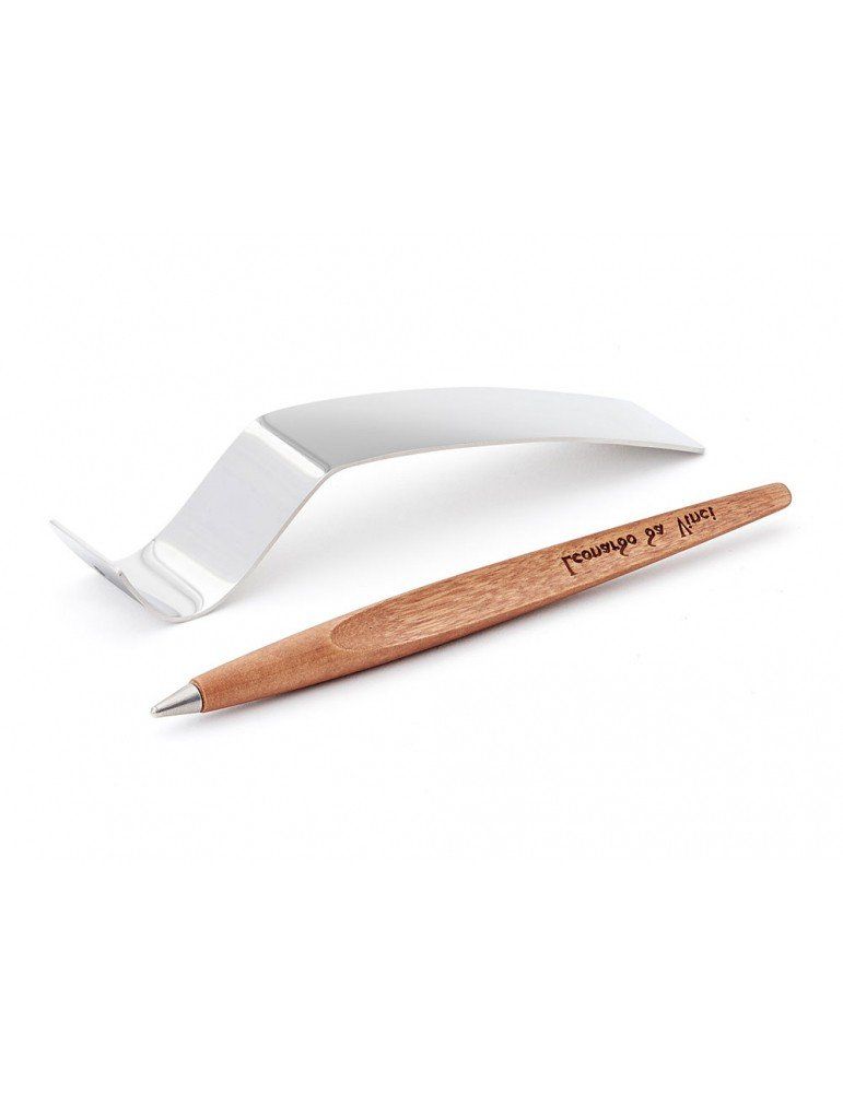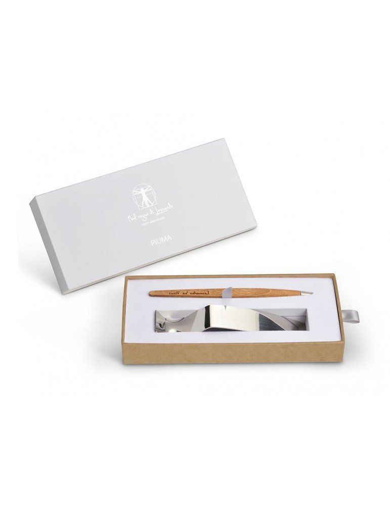 La riflessione su questi testi lasciati da Leonardo ha portato alla creazione di Piuma, uno strumento da scrittura realizzato completamente in legno, dalla forma dinamica, che rimanda alla penna d’oca e agli studi sul volo. Piuma appoggia in costante equilibrio sul suo baricentro grazie al piedistallo in acciaio specchiato attraverso il quale è riflessa la firma speculare del maestro.