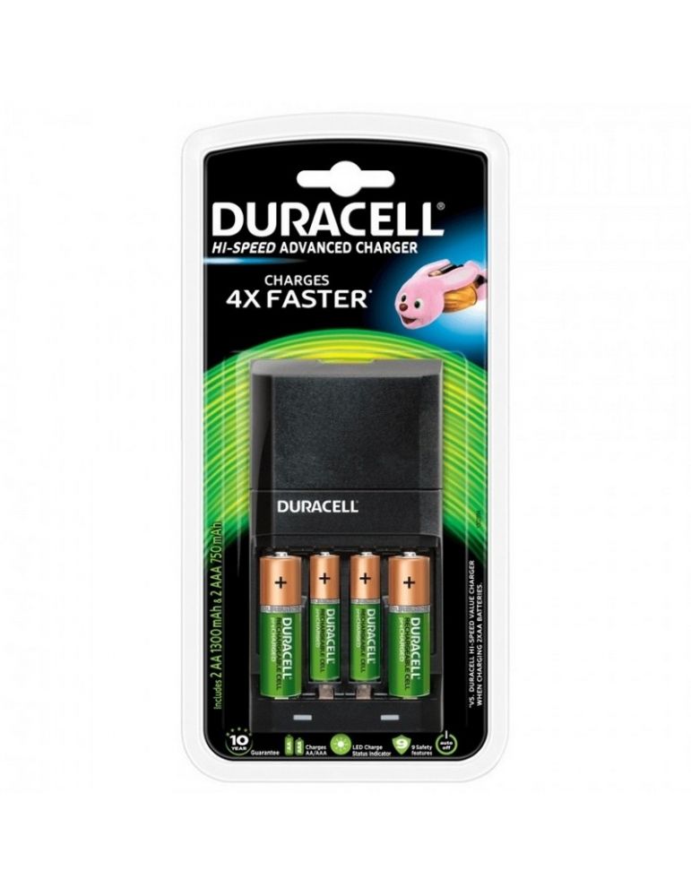 Questo caricatore Duracell può ricaricare le pile AA e AAA in solo 15 minuti. Creato per batterie del tipo NiMH. Possiede 2 vie di ricarica, permettendoli di caricare 2 o 4 batterie allo stesso tempo.