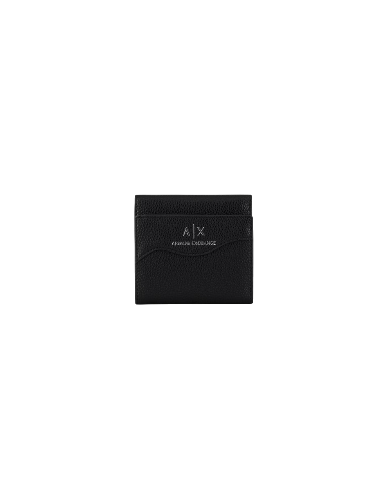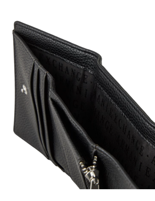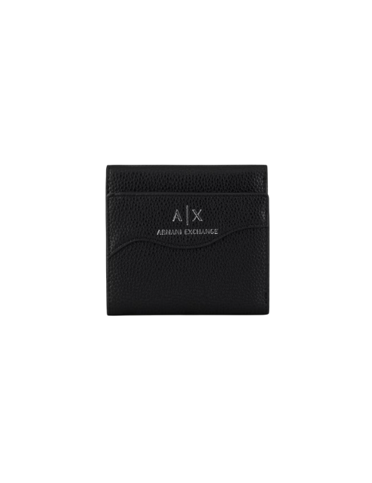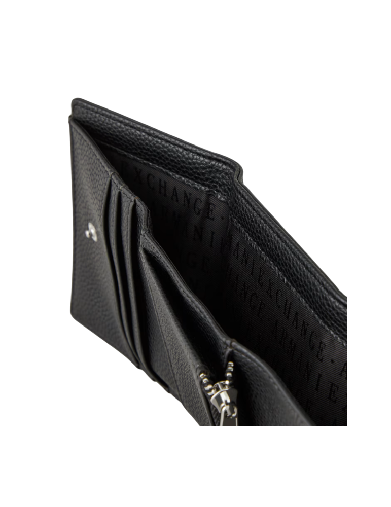 Effetto martellato per il piccolo portafoglio con impuntura sagomata, arricchito dalla scritta logo a contrasto. L'accessorio presenta chiusura con bottone a pressione, scomparti portacarte e portamonete con cerniera.
