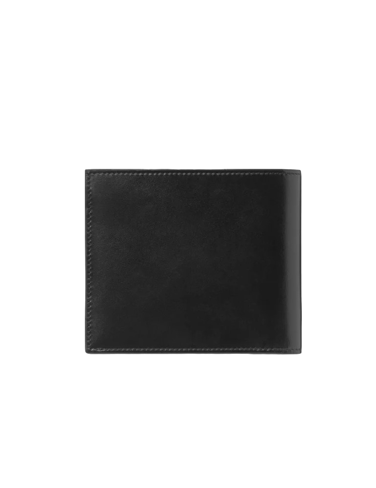 Portafoglio 8 scomparti, in pelle di vitello pieno fiore europea, nero lucido esclusivo Montblanc, fodera jacquard con marchio Montblanc, emblema Montblanc con anello finitura palladio, 8 tasche per carte di credito, 2 scomparti per banconote, 2 tasche extra.
