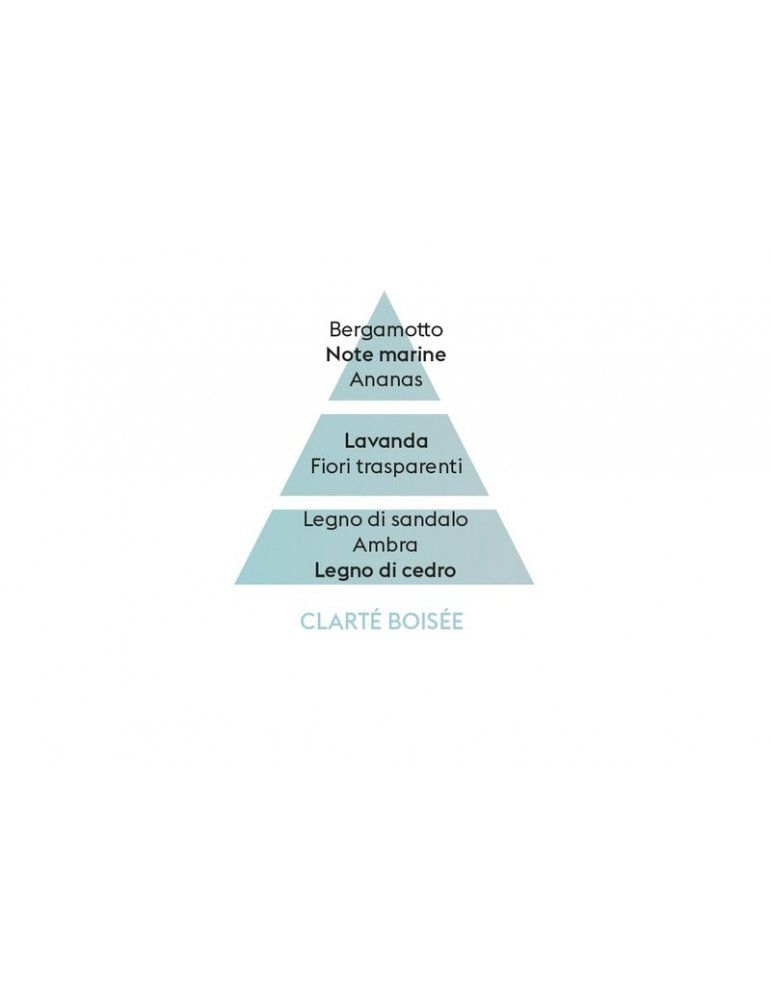 Clarté Boisée è un profumo per lampada Berger fresco e aromatico. Le note marine si fondono con le zèste di bergamotto e con l’odore fruttato dell’ananas. Il suo cuore floreale, composto di lavanda e di fiori trasparenti, è sottolineato da un fondo legnoso di cedro e di sandalo e dal calore dell’ambra. Un profumo misto e in linea con un ambiente contemporaneo e all'avanguardia.