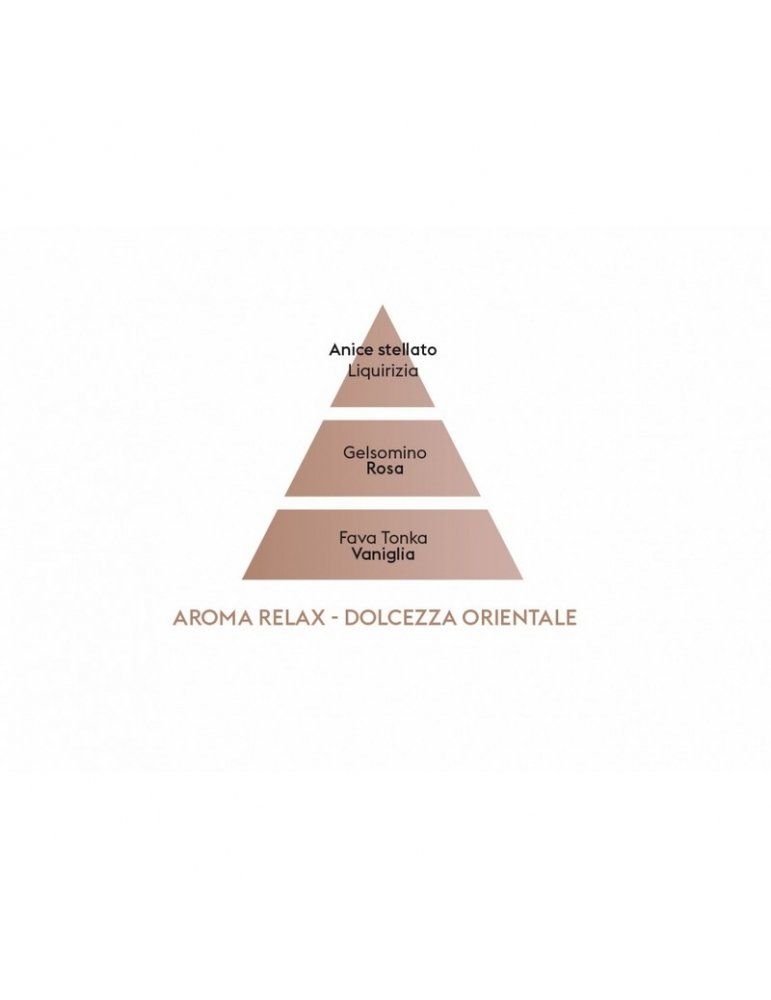 Il corpo si lascia travolgere con delizia dai mille effluvi di un Oriente lussureggiante. L’animo si apre, la malinconia cessa, si profilano infinite possibilità di gioia: si instaura un’atmosfera meditativa, finalmente! Questa versione Relax Douceur Orientale della collezione Aroma è una promessa di assoluto relax. Tutto si indirizza verso la ricerca di benessere. Fin dalle prime note, anice stellato e liquirizia annunciano un Oriente di delizie profumate. Il cuore, anch’esso floreale, teneramente fruttato, si esprime dolcemente, con voluttà. Poi si instaura l’equilibrio su un fondo caldo, a tratti goloso, di fava Tonka e vaniglia. Ed è su questa armonia olfattiva che può sbocciare un trio di oli essenziali selezionati con cura: grazie alle loro proprietà, patchouli, legno di gaiac e geranio sfoderano le loro qualità antistress e anti-depressive.