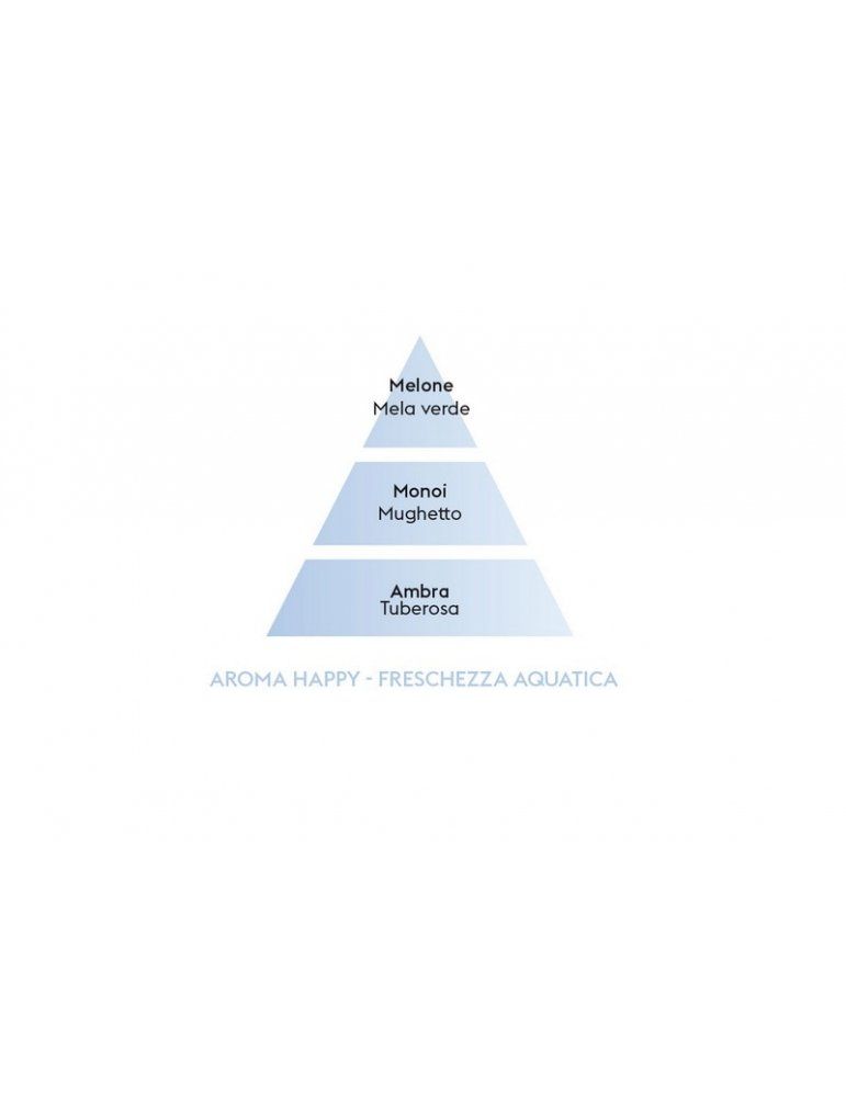 Un frutto estivo saporito, sapori aciduli, un’onda che rigenera, un olio che libera... Un sentimento lieve, qualcosa che somiglia alla felicità! Nella collezione Aroma, questa versione Happy Fraîcheur Aquatique è una sintesi di benessere. La scelta dell’olio essenziale di eugenolo per iniziare, con i suoi slanci tonici, le sue proprietà tonificanti, e la composizione olfattiva che l’accompagna, l’infinita croccantezza della mela verde, il sapore acquatico di un melone estivo. Segue il cuore presieduto dal monoi e gli accenti solari di un bouquet floreale installato sulla rotonda dolcezza di un fondo ambrato e la golosità di un trio di vaniglia, noce di cocco e pesca.