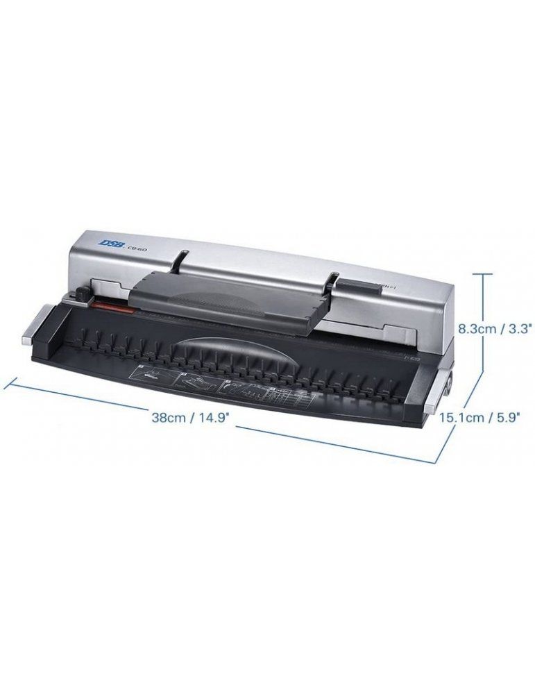 Rilegatrice C60 per dorsi plastici 21 anelli, capacita' 8 fogli, rilegatura dorso 6-12 mm, manuale. Profondita' di perforazione 2,5 mm, caricamento orizzontale, peso 1,5 kg, dimensioni 360x155x85.