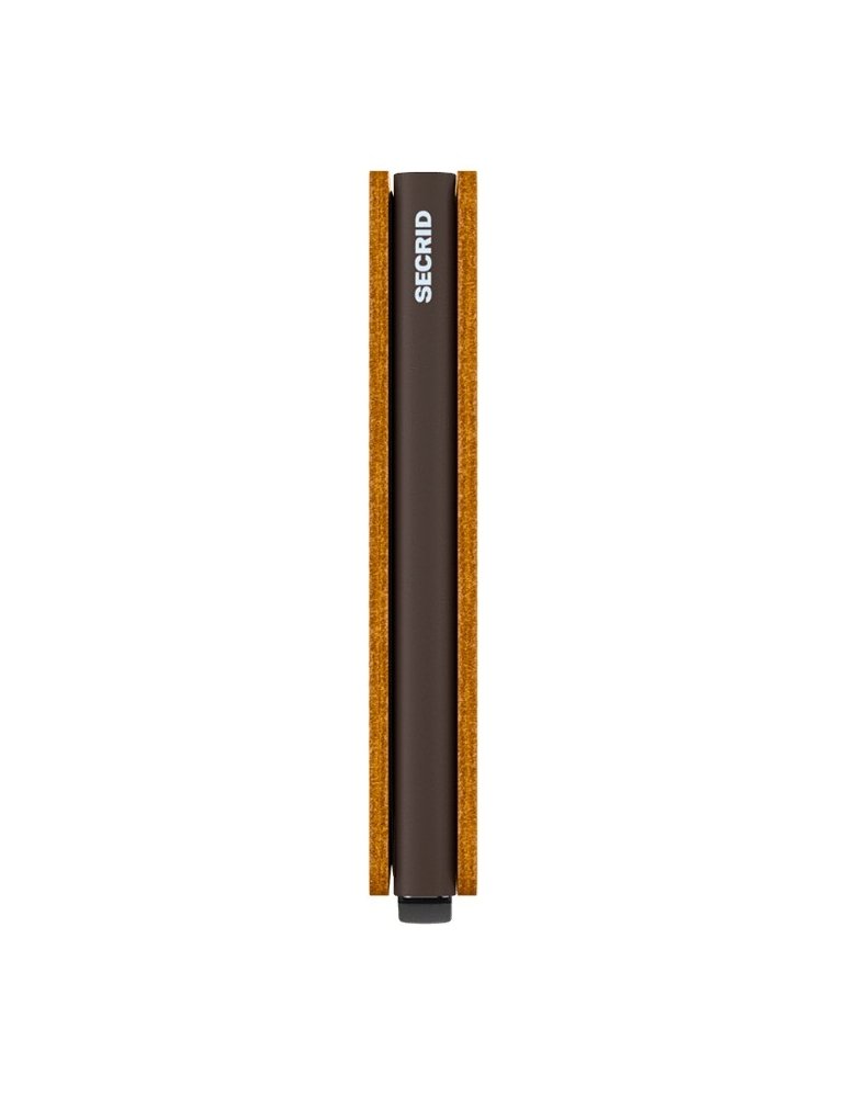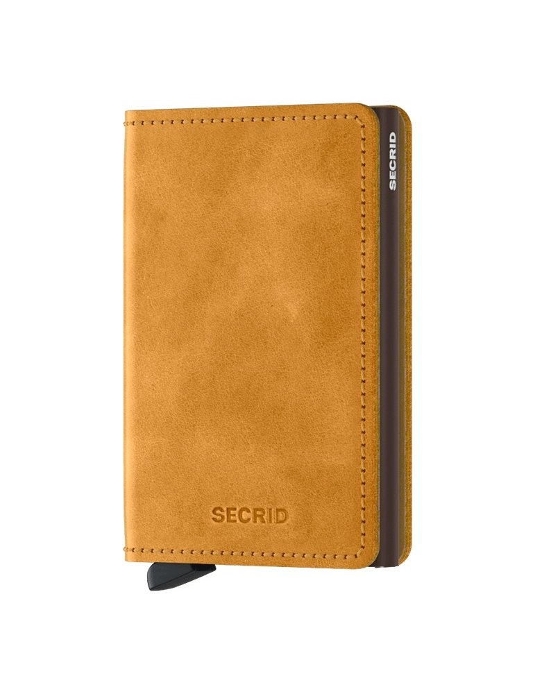 Portacarte Vintage Ochre dal meccanismo brevettato che consente di estrarre le carte con un unico, semplice movimento.