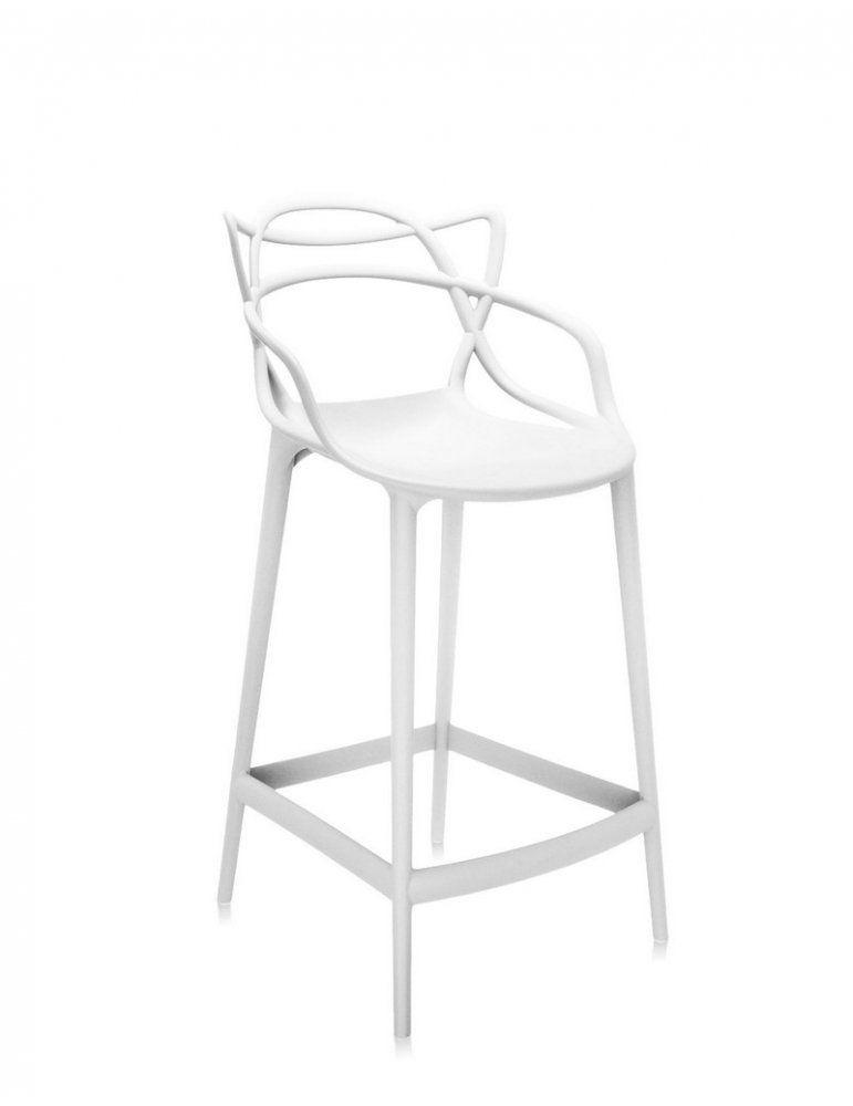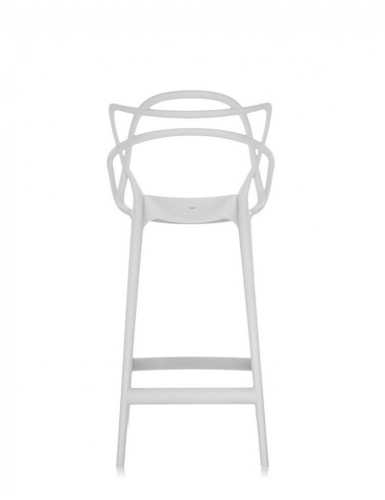 Nella versione a sgabello della sedia Masters, le gambe si allungano, la seduta diventa più contenuta, ma l’inconfondibile segno grafico della struttura, dato dall'intreccio delle silhouette di tre iconiche sedute, rimane il medesimo.