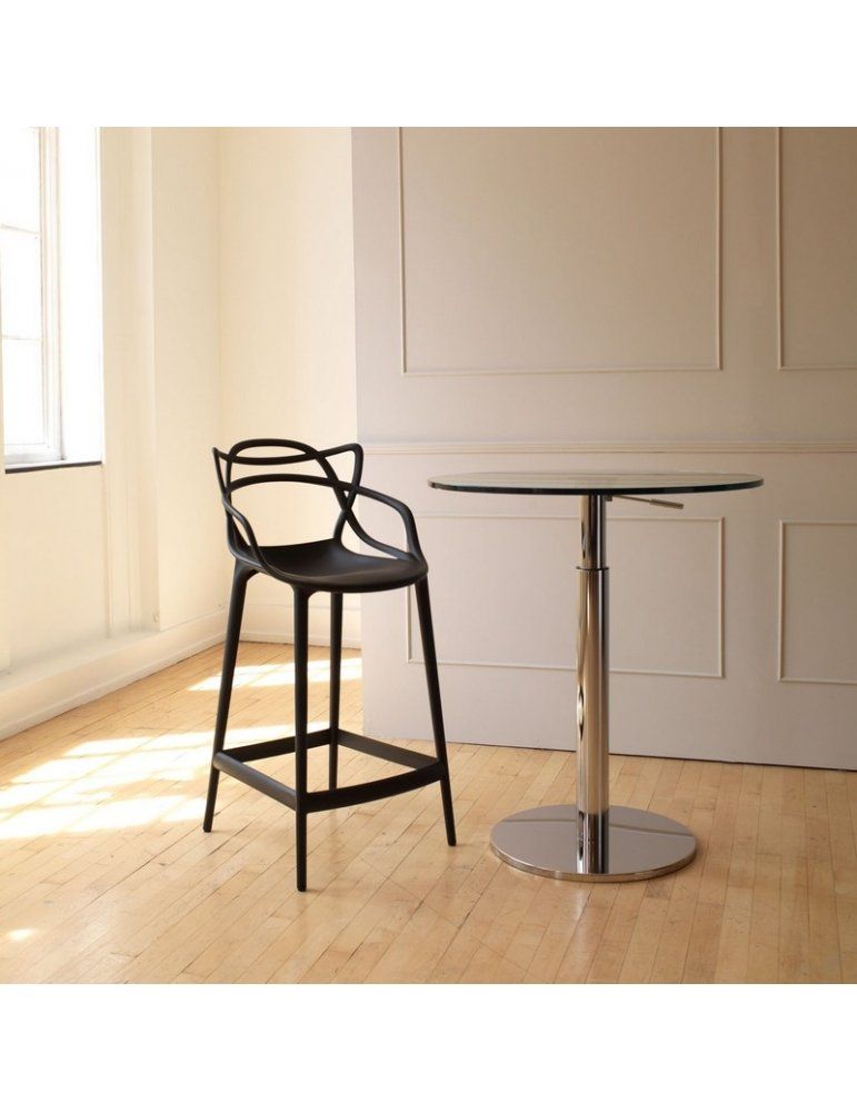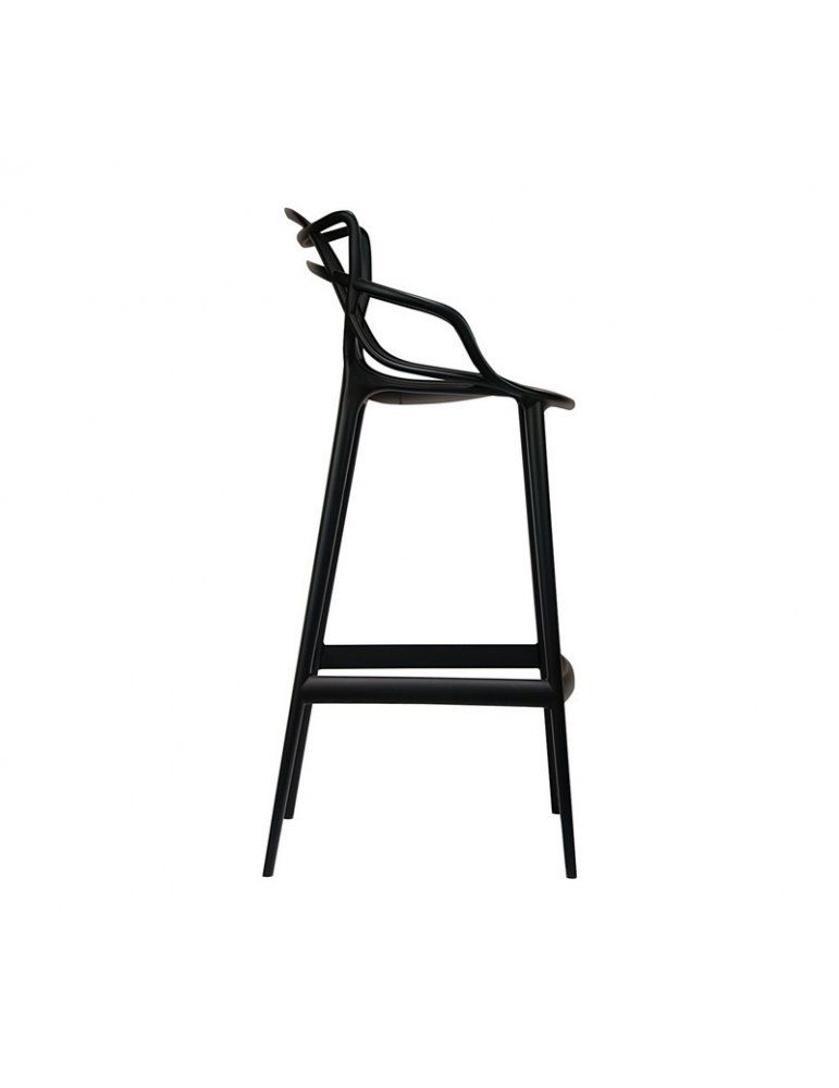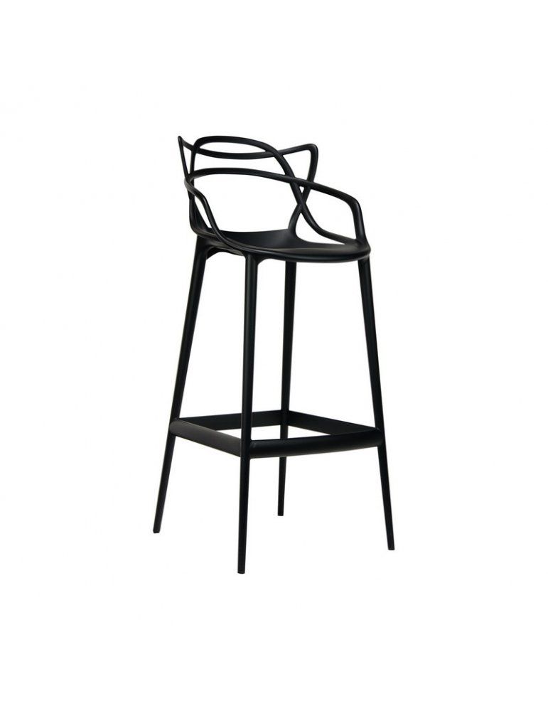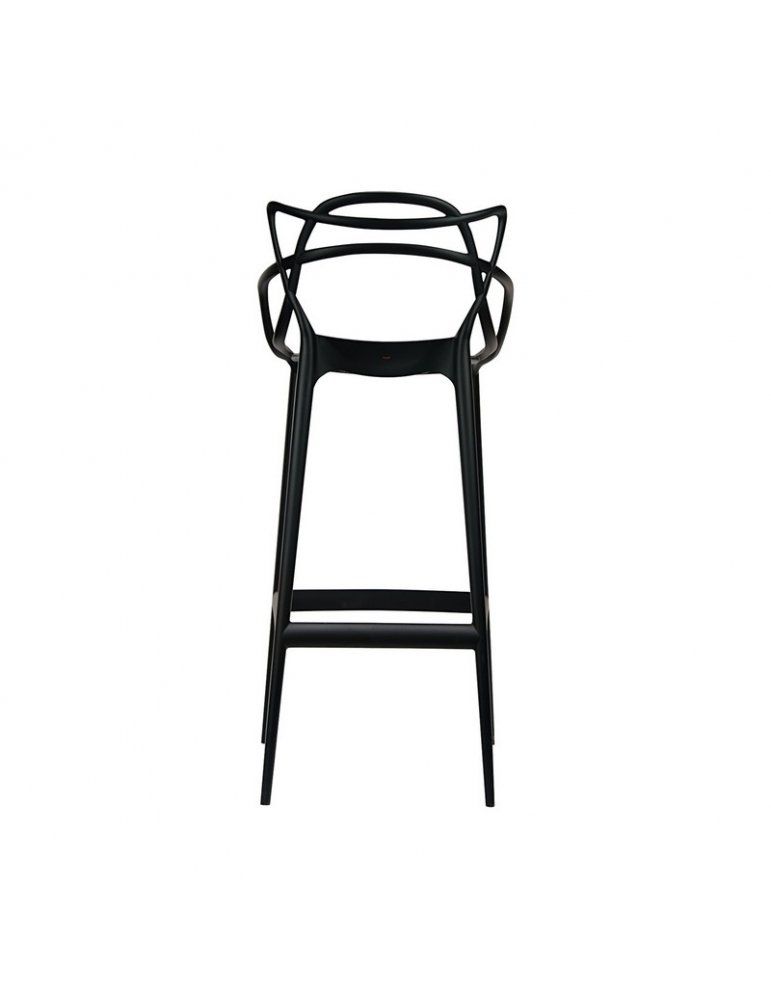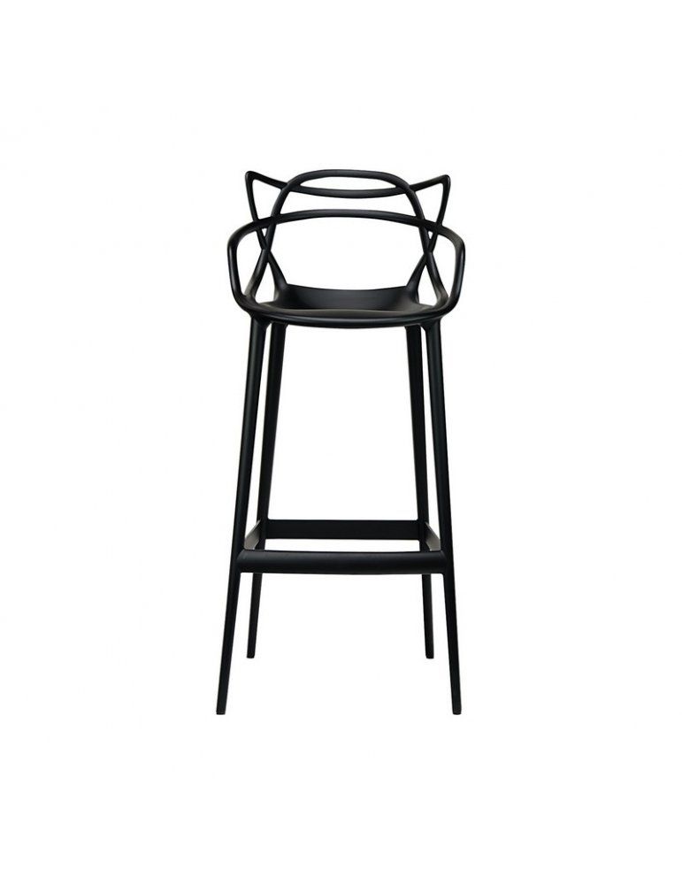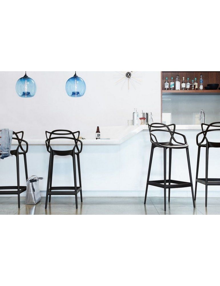 Nella versione a sgabello della sedia Masters, le gambe si allungano, la seduta diventa più contenuta, ma l’inconfondibile segno grafico della struttura, dato dall'intreccio delle silhouette di tre iconiche sedute, rimane il medesimo.