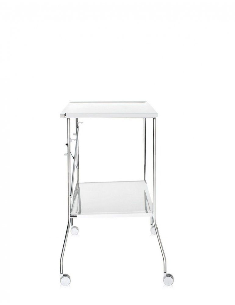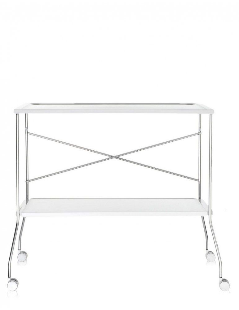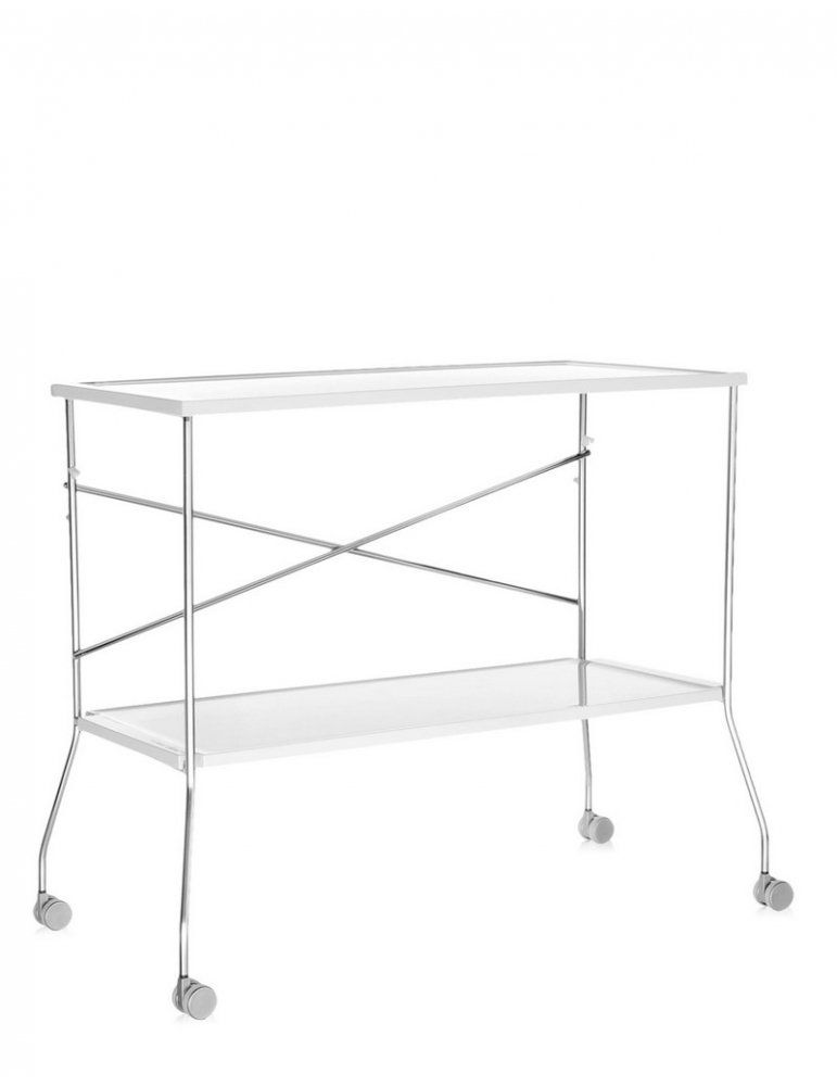 modello Flip, con doppio ripiano, quattro ruote, e colore bianco dei ripiani