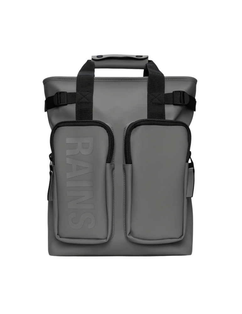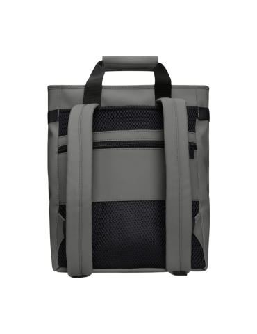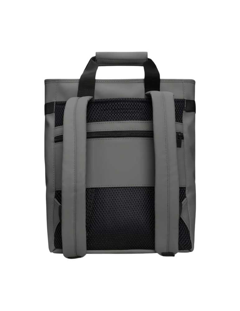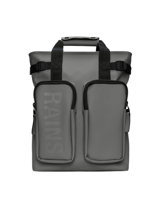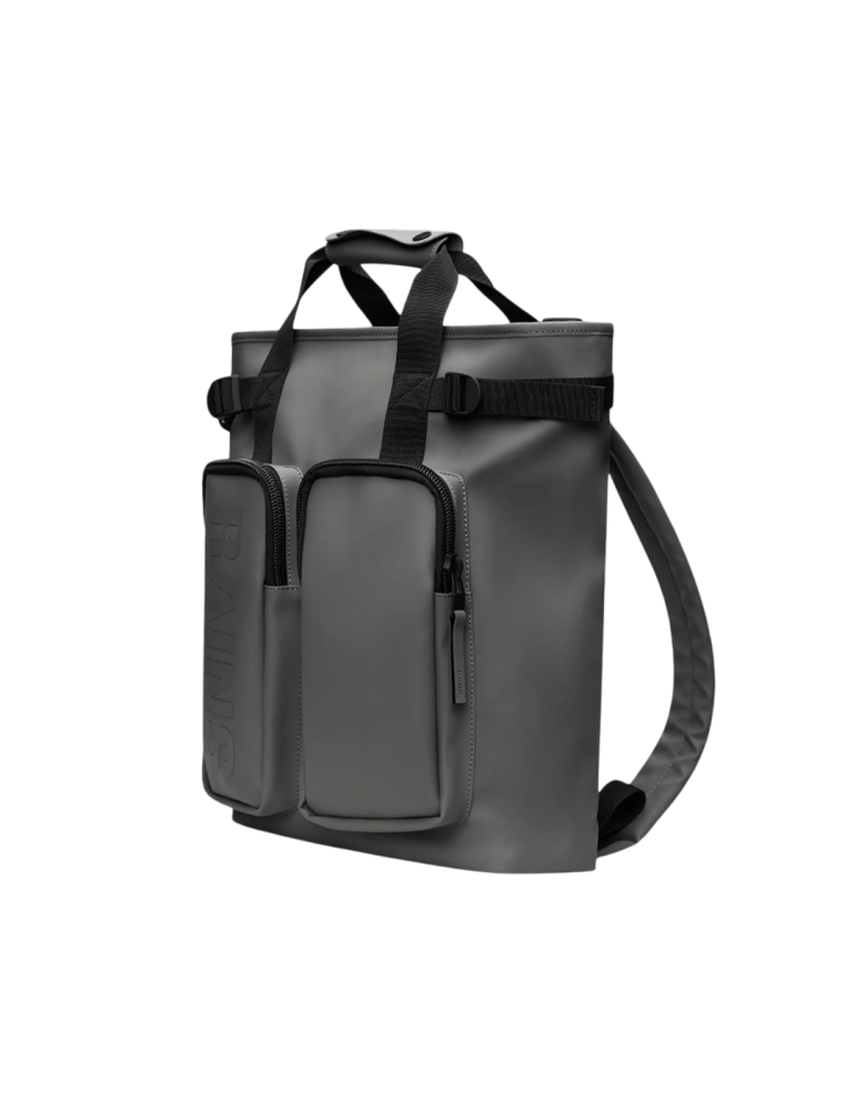 La Texel Tote Backpack è una borsa ibrida con tasca imbottita per laptop, pensata per i viaggi brevi. Il modello è realizzato nell'iconico tessuto impermeabile in PU di Rains.